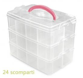 Una comoda scatola in plastica trasparente a scomparti modulabili per tenere in ordine o trasportare accessori e perline.